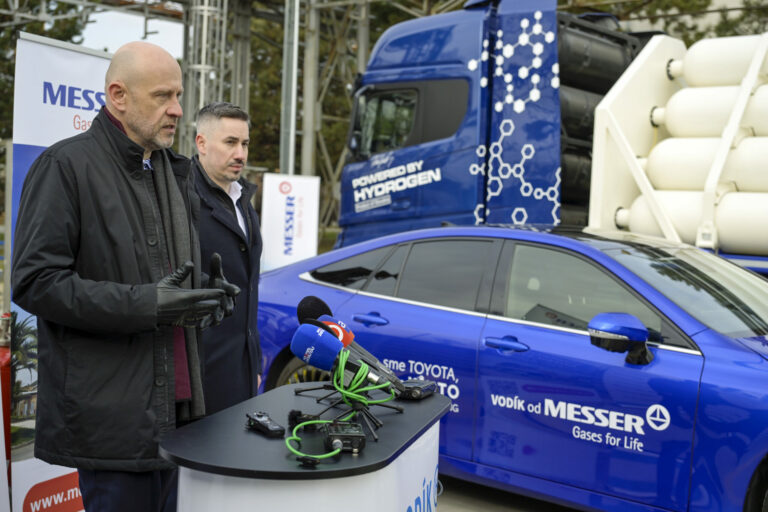 Sprava: Riaditeľ útvaru New and Sustainable Businesses zo Slovnaftu Tomáš Beseda a generálny riaditeľ spoločnosti Messer Tatragas Michal Paľa počas tlačovej besedy spoločností Messer Tatragas a Slovnaft v priestoroch vodíkovej plniacej stanice v areáli Slovnaftu na tému: Bratislavská vodíková plnička mení ekologickú dopravu - dojazd vodíkových autobusov DPB sa zvýšil o 40 %, počet stojanov sa zdvojnásobil. Bratislava, 21. február 2025. Foto: SITA/Milan Illík