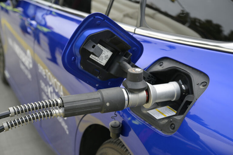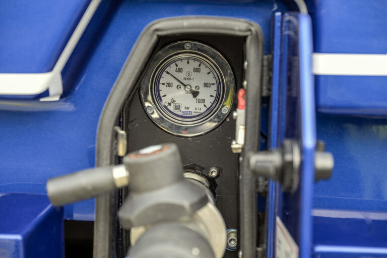 Detail nádrže auta počas plnenia vodíkom v rámci tlačovej besedy spoločností Messer Tatragas a Slovnaft v priestoroch vodíkovej plniacej stanice v areáli Slovnaftu na tému: Bratislavská vodíková plnička mení ekologickú dopravu - dojazd vodíkových autobusov DPB sa zvýšil o 40 %, počet stojanov sa zdvojnásobil. Bratislava, 21. február 2025. Foto: SITA/Milan Illík