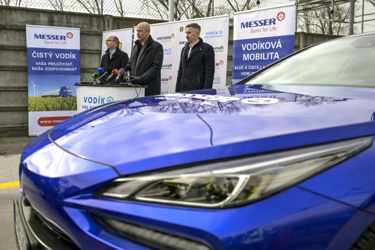 Zľava: Riaditeľ útvaru New and Sustainable Businesses zo Slovnaftu Tomáš Beseda, generálny riaditeľ spoločnosti Messer Tatragas Michal Paľa a manažér aplikácii spoločnosti Messer Tatragas Juraj Perovič počas tlačovej besedy spoločností Messer Tatragas a Slovnaft v priestoroch vodíkovej plniacej stanice v areáli Slovnaftu na tému: Bratislavská vodíková plnička mení ekologickú dopravu - dojazd vodíkových autobusov DPB sa zvýšil o 40 %, počet stojanov sa zdvojnásobil. Bratislava, 21. február 2025. Foto: SITA/Milan Illík
