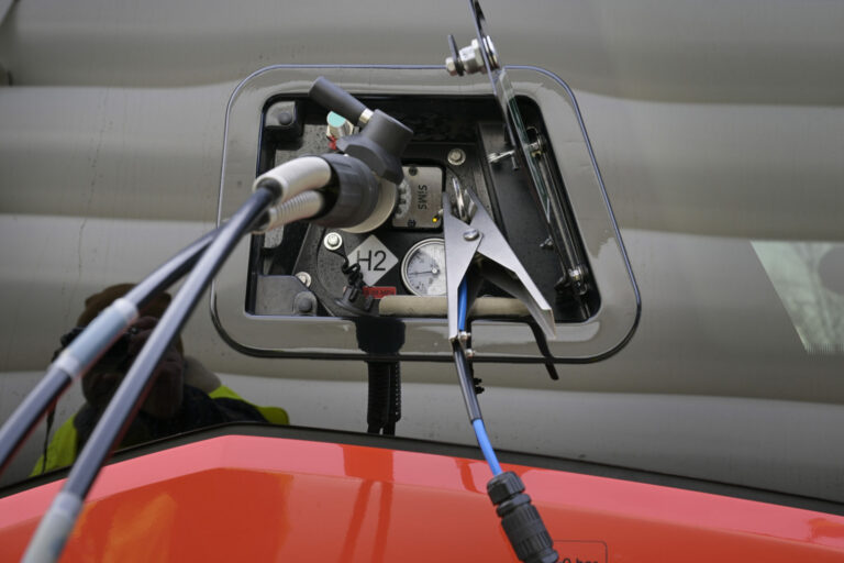 Detail nádrže nákladného auta počas plnenia vodíkom v rámci tlačovej besedy spoločností Messer Tatragas a Slovnaft v priestoroch vodíkovej plniacej stanice v areáli Slovnaftu na tému: Bratislavská vodíková plnička mení ekologickú dopravu - dojazd vodíkových autobusov DPB sa zvýšil o 40 %, počet stojanov sa zdvojnásobil. Bratislava, 21. február 2025. Foto: SITA/Milan Illík