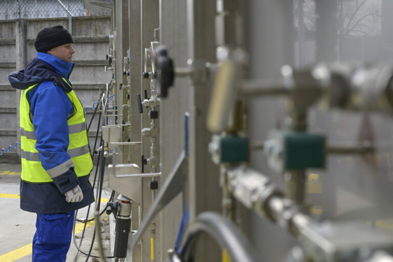 Pracovník obsluhujúci vodíkovú čerpaciu stanicu v rámci tlačovej besedy spoločností Messer Tatragas a Slovnaft v priestoroch vodíkovej plniacej stanice v areáli Slovnaftu na tému: Bratislavská vodíková plnička mení ekologickú dopravu - dojazd vodíkových autobusov DPB sa zvýšil o 40 %, počet stojanov sa zdvojnásobil. Bratislava, 21. február 2025. Foto: SITA/Milan Illík