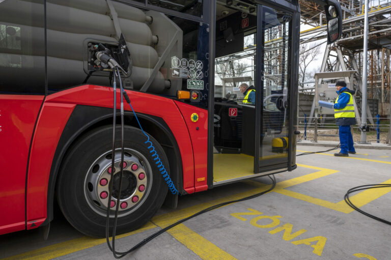 Autobus počas plnenia nádrže vodíkom v rámci tlačovej besedy spoločností Messer Tatragas a Slovnaft v priestoroch vodíkovej plniacej stanice v areáli Slovnaftu na tému: Bratislavská vodíková plnička mení ekologickú dopravu - dojazd vodíkových autobusov DPB sa zvýšil o 40 %, počet stojanov sa zdvojnásobil. Bratislava, 21. február 2025. Foto: SITA/Milan Illík