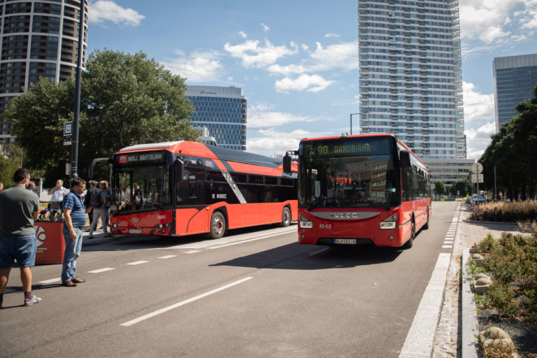 Vodíkové autobusy počas predstavenia flotily plnohodnotných vodíkových autobusov na Slovensku Dopravným podnikom Bratislava (DPB). Bratislava, 31. júl 2023. Foto: SITA/Diana Černaková