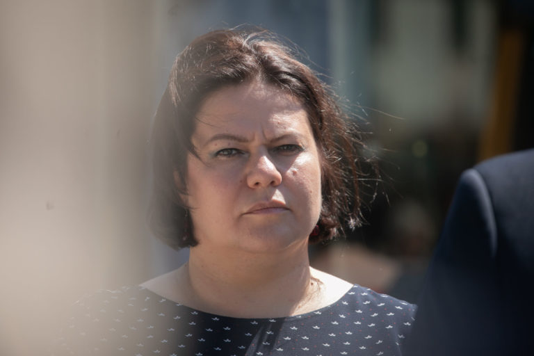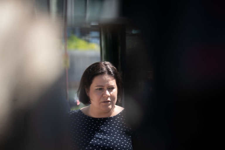 Štátna tajomníčka Ministerstva investícií, regionálneho rozvoja a informatizácie SR Barbora Lukáčová počas brífingu, na ktorom Dopravný podnik Bratislava (DPB) predstavil flotilu plnohodnotných vodíkových autobusov na Slovensku. Bratislava, 31. júl 2023. Foto: SITA/Diana Černaková