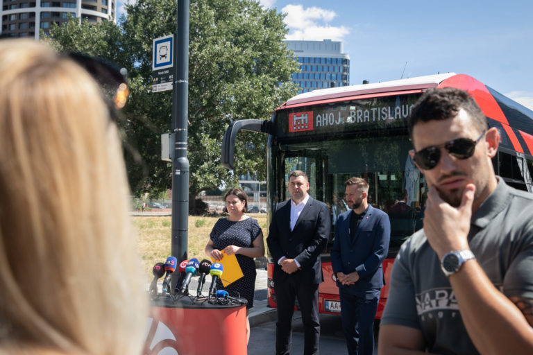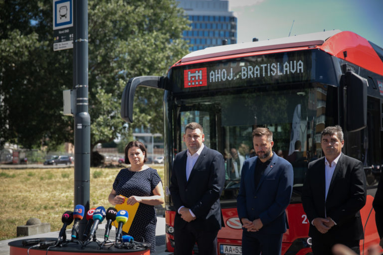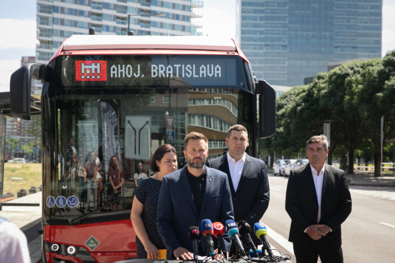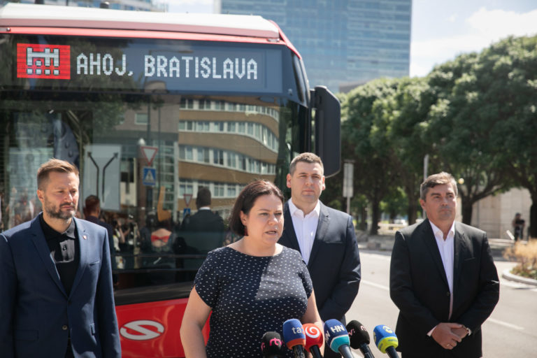 Zľava: Štátna tajomníčka Ministerstva investícií, regionálneho rozvoja a informatizácie SR Barbora Lukáčová, predseda predstavenstva DPB Martin Rybanský, primátor Bratislavy Matúš Vallo a obchodný riaditeľ Messer Peter Mikula počas brífingu, na ktorom Dopravný podnik Bratislava (DPB) predstavil flotilu plnohodnotných vodíkových autobusov na Slovensku. Bratislava, 31. júl 2023. Foto: SITA/Diana Černaková