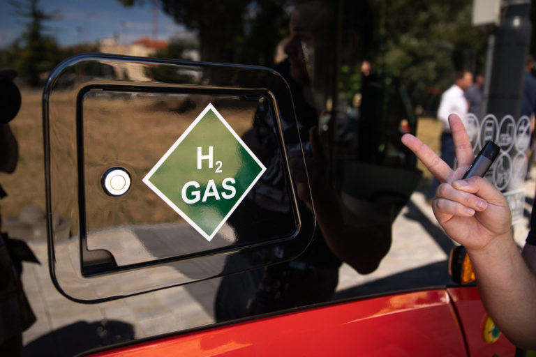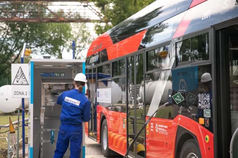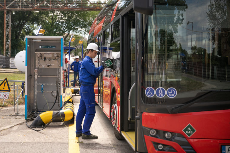 Tankovanie vodíkového autobusu počas predstavenia flotily plnohodnotných vodíkových autobusov na Slovensku Dopravným podnikom Bratislava (DPB). Bratislava, 31. júl 2023. Foto: SITA/Diana Černaková