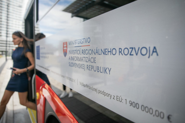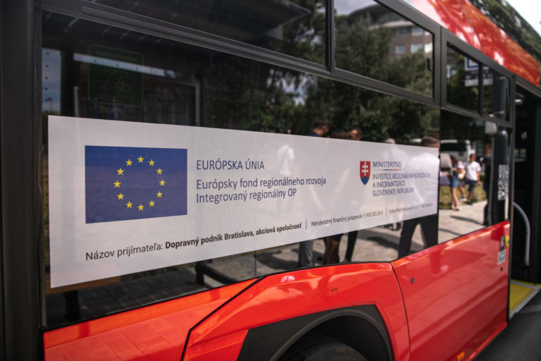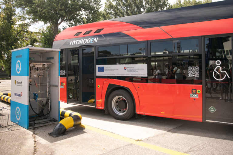 Vodíkový autobus počas predstavenia flotily plnohodnotných vodíkových autobusov na Slovensku Dopravným podnikom Bratislava (DPB). Bratislava, 31. júl 2023. Foto: SITA/Diana Černaková