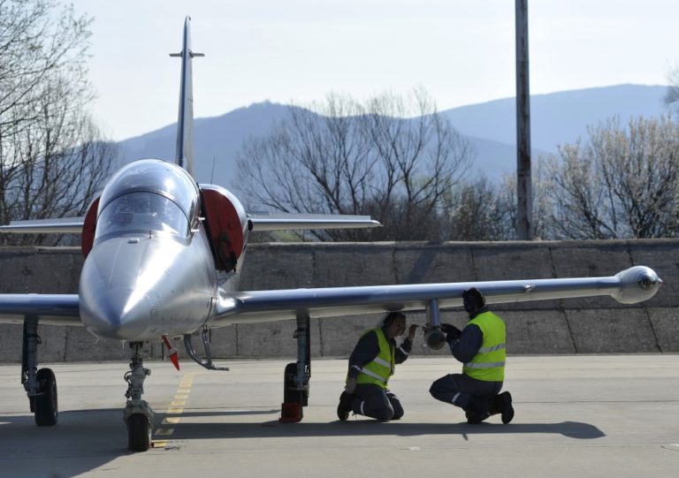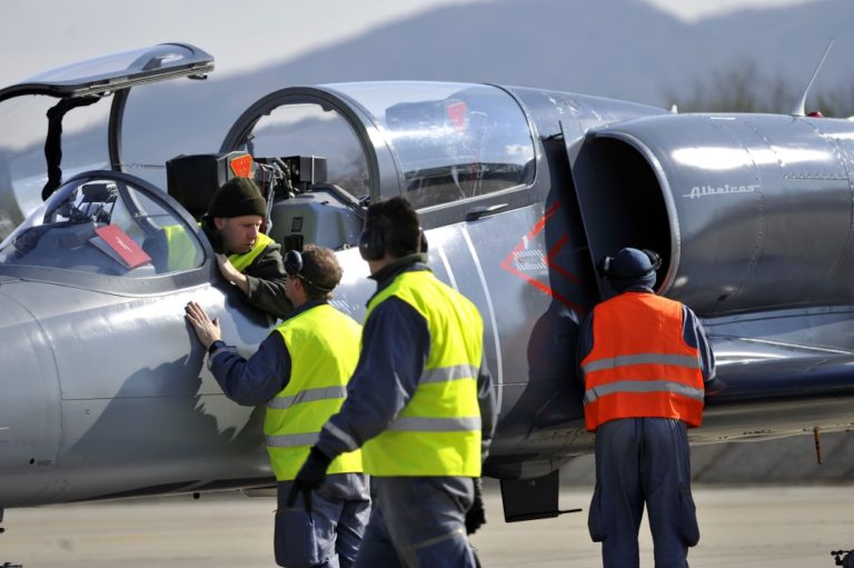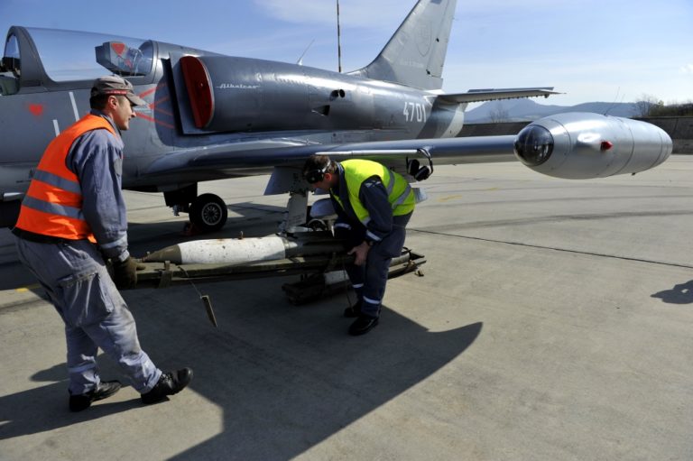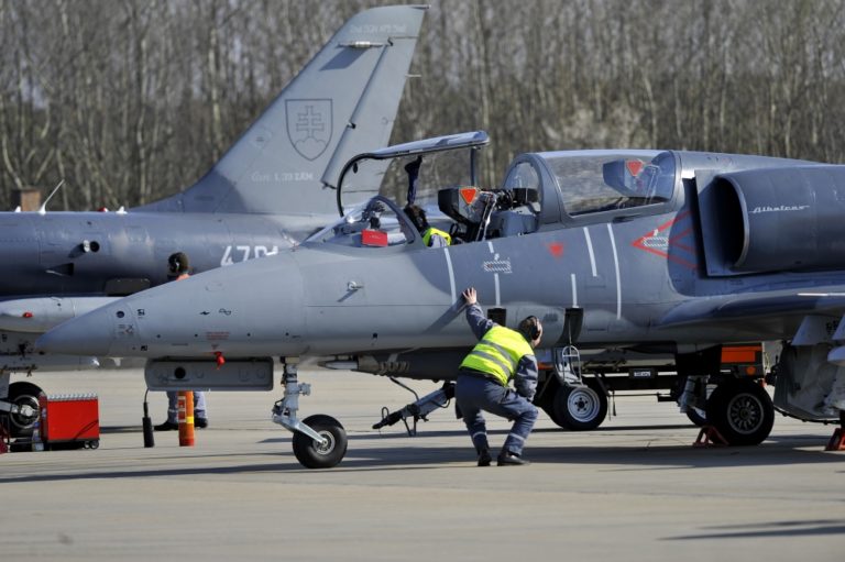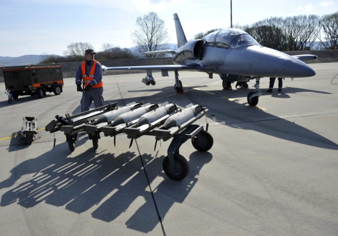 Príslušníci Zmiešaného krídla Otta Smyka Sliač počas prípravy lietadiel L-39 Albatros na Letisku Kuchyňa na nácvik streľby vo vojenskom priestore Záhorie. Kuchyňa, 26. marec 2014. Foto: SITA/Ján Slovák