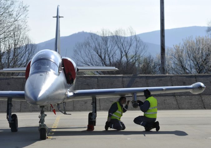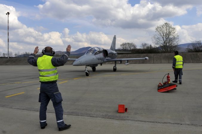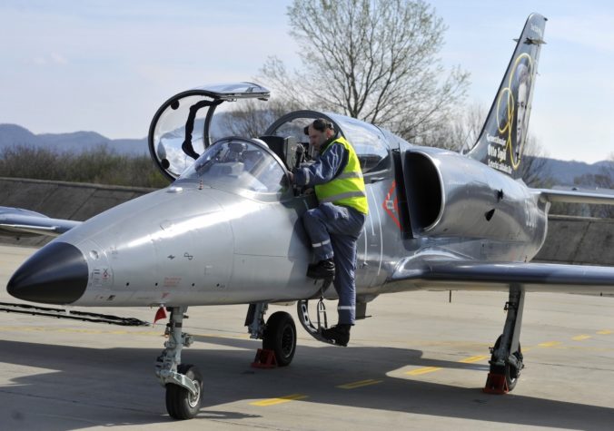 Lietadlo L-39 Albatros Zmiešaného krídla Otta Smyka Sliač po pristátí na Letisku Kuchyňa po nácviku streľby vo vojenskom priestore Záhorie. Kuchyňa, 26. marec 2014. Foto: SITA/Ján Slovák