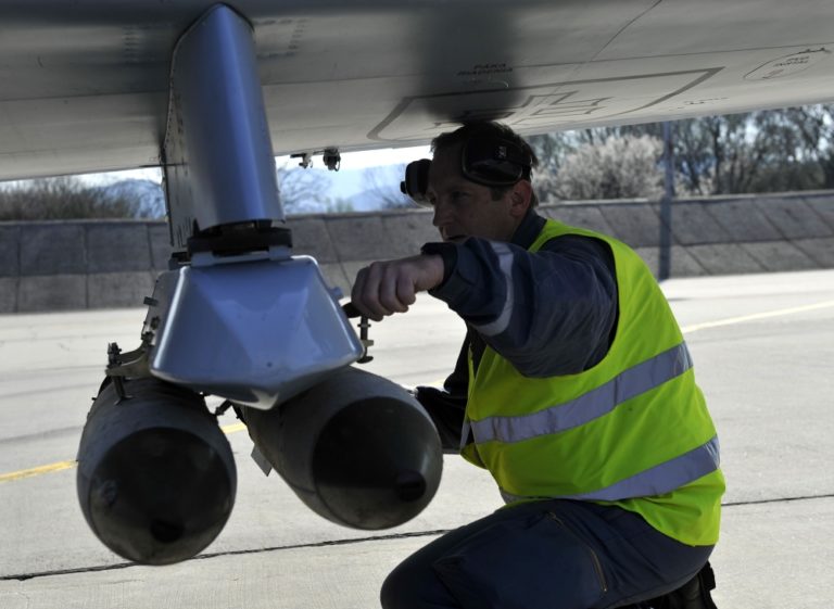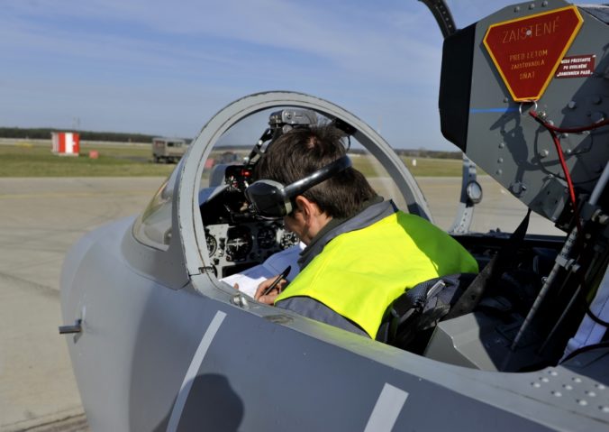 Príslušník Zmiešaného krídla Otta Smyka Sliač počas prípravy lietadiel L-39 Albatros na Letisku Kuchyňa na nácvik streľby vo vojenskom priestore Záhorie. Kuchyňa, 26. marec 2014. Foto: SITA/Ján Slovák