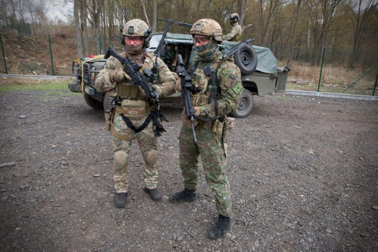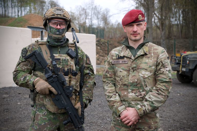 Sprava: Veliteľ bojového zoskupenia NATO na Slovensku podplukovník Ivo Zelinka a príslušník 52. výsadkového práporu slovenských špeciálnych síl OS SR počas cvičenia Mnohonárodného bojového uskupenia NATO na Slovensku v Centre výcviku Lešť. Foto: SITA/Jakub Julény