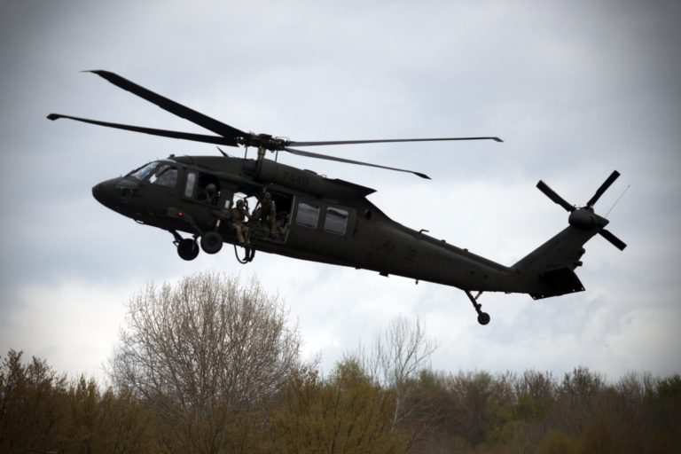 Vrtulník UH 60 Blackhawk počas cvičenia Mnohonárodného bojového uskupenia NATO na Slovensku v Centre výcviku Lešť. Foto: SITA/Jakub Julény
