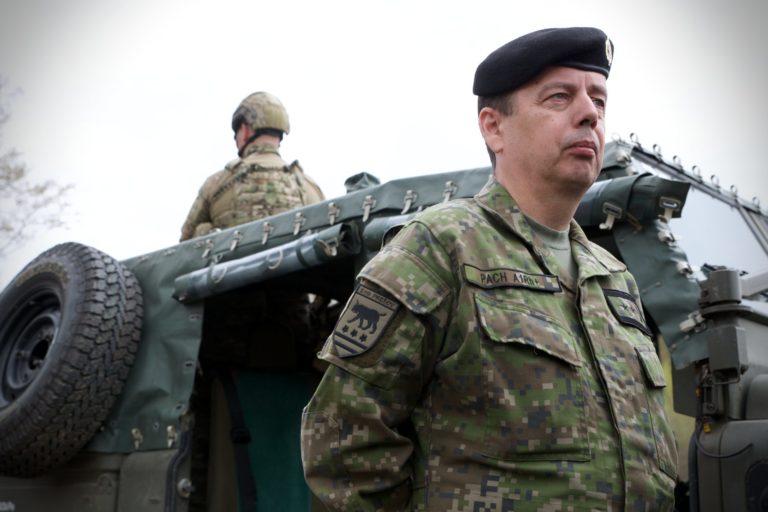 Veliteľ pozemných síl OS SR generálmajor Ivan Pach (vpravo) počas cvičenia Mnohonárodného bojového uskupenia NATO na Slovensku v Centre výcviku Lešť. Foto: SITA/Jakub Julény