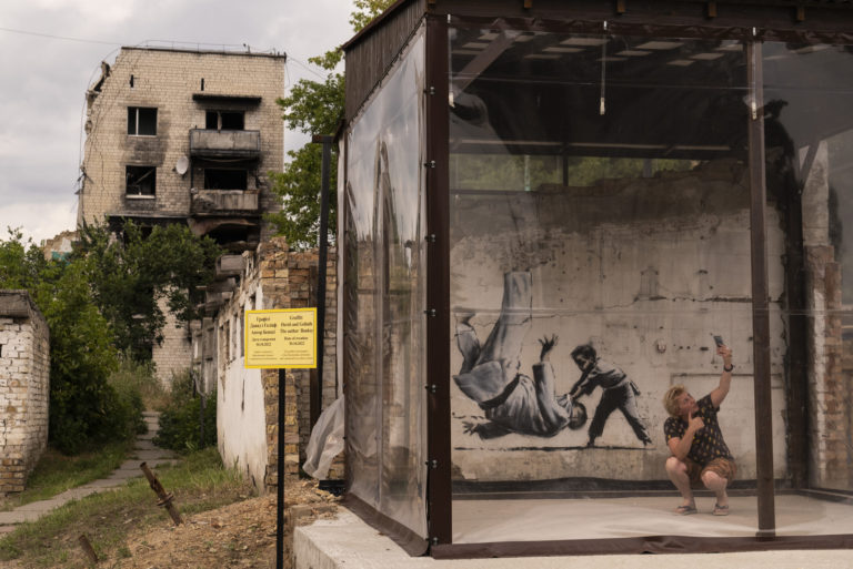 Žena si robí selfie s Banksyho umeleckým dielom na stene budovy poškodenej ruskými útokmi v Borodyanke na Ukrajine v stredu 2. augusta 2023. Foto: SITA/AP