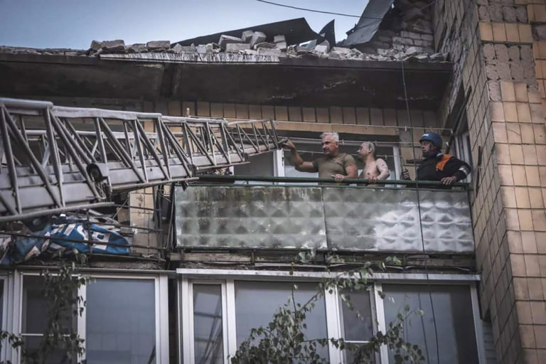 Na snímke ukrajinskej pohotovostnej služby záchranári evakuujú ľudí z poškodenej budovy po ruských raketových útokoch v Pokrovsku v Doneckej oblasti na Ukrajine v pondelok 7. augusta 2023. Foto: Ukrainian Emergency Service via AP Photo