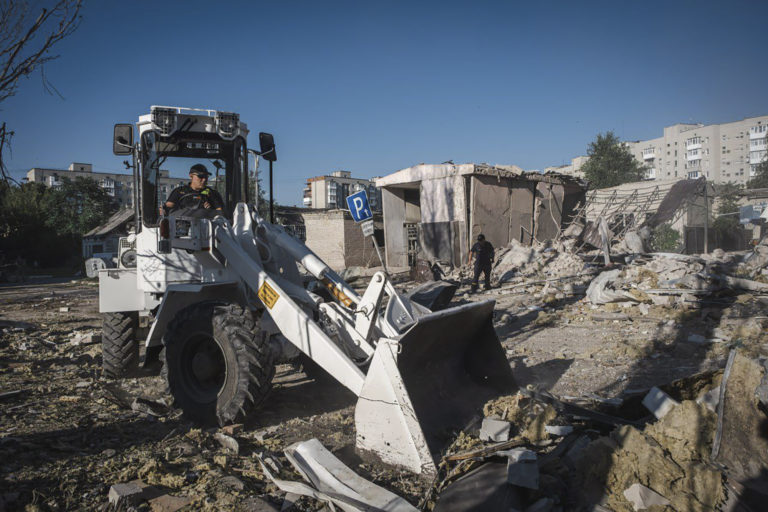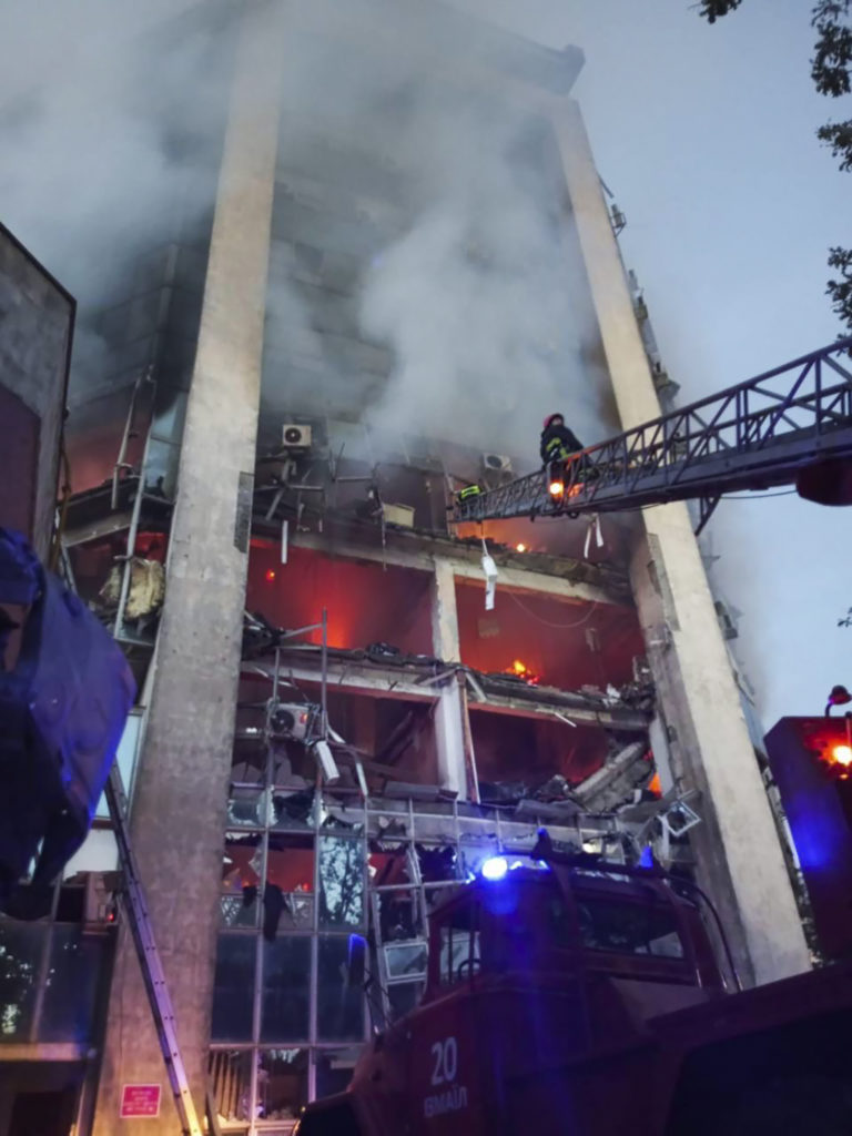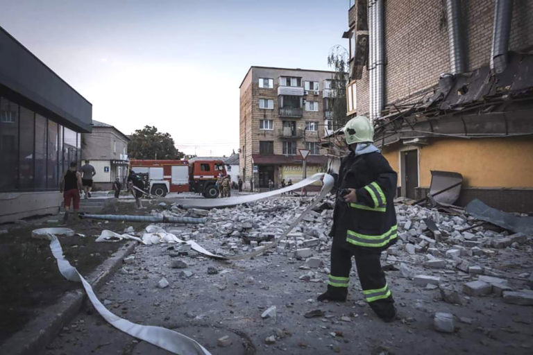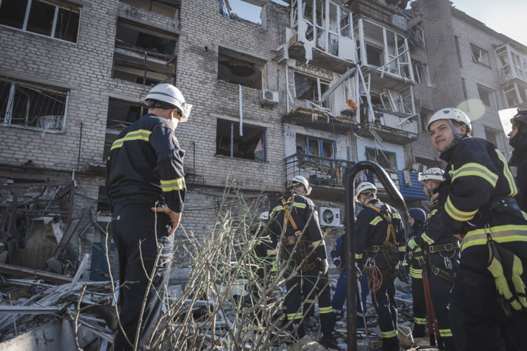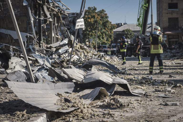 Na snímke ukrajinskej záchrannej služby záchranári pracujú na mieste, kde sa nachádza budova poškodená po útoku ruských rakiet v Pokrovsku v Doneckej oblasti na Ukrajine v utorok 8. augusta 2023. Foto: Ukrainian Emergency Service via AP Photo