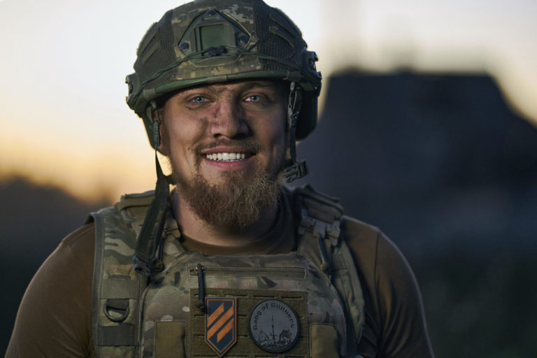 Ukrajinský vojak sa usmieva na frontovej línii pri Bachmute, na Ukrajine. Foto: SITA/AP