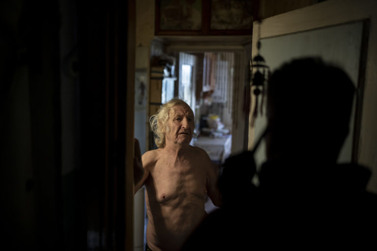 Vasilij Korotych povedal ukrajinskému dobrovoľníkovi Červeného kríža, že si neželá byť evakuovaný zo svojho domu v Kupjansku na Ukrajine v pondelok 14. augusta 2023. Foto: SITA/AP