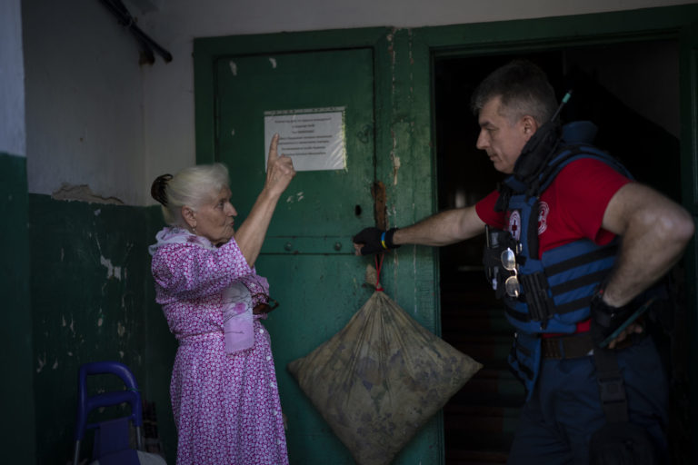 Žena hovorí dobrovoľníkovi ukrajinského Červeného kríža, že si neželá byť evakuovaná v Kupjansku na Ukrajine v pondelok 14. augusta 2023. Foto: SITA/AP