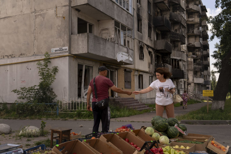 Nakupujúci dostane vzorku chuti od predajcu ovocia pred obytným domom zničeným pri ruských útokoch v Borodyanke na Ukrajine v stredu 2. augusta 2023. Foto: SITA/AP