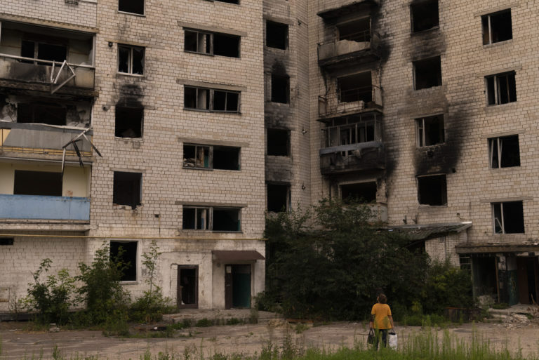 Žena sa zastaví, aby si prezrela bytový dom ťažko poškodený pri ruských útokoch v Borodyanke na Ukrajine v stredu 2. augusta 2023. Foto: SITA/AP