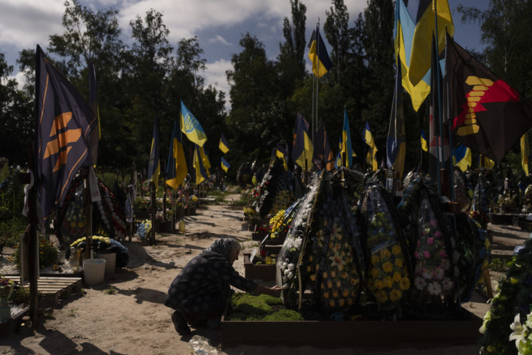 Natalie Zaichenko (60) sa stará o hrob svojho syna, ukrajinského vojaka, ktorý padol vo vojne proti Rusku, v Kyjeve na Ukrajine vo štvrtok 3. augusta 2023. Foto: SITA/AP