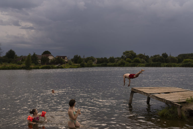 Ľudia sa ochladzujú v jazere v Borodyanke na Ukrajine v stredu 2. augusta 2023. Foto: SITA/AP