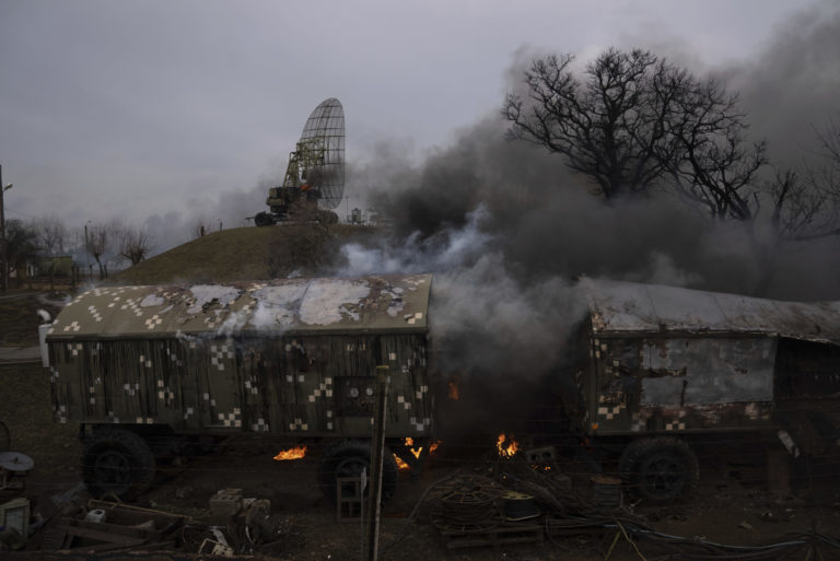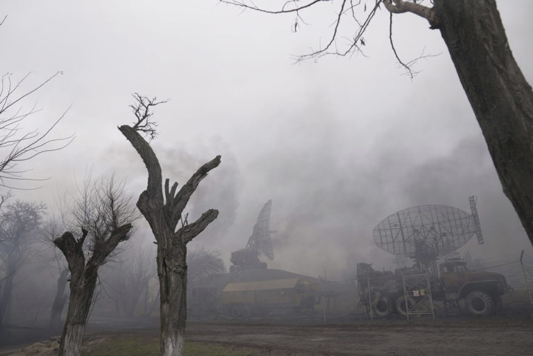 Dym stúpajúci zo základne protivzdušnej obrany v Mariupole na Ukrajine. Poškodené je aj vybavenie a radary. Foto: SITA/AP