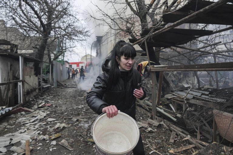 Žena pred pôrodnicou, ktorá bola poškodená ostreľovaním v Mariupole na Ukrajine, v stredu 9. marca 2022. Foto: SITA/AP