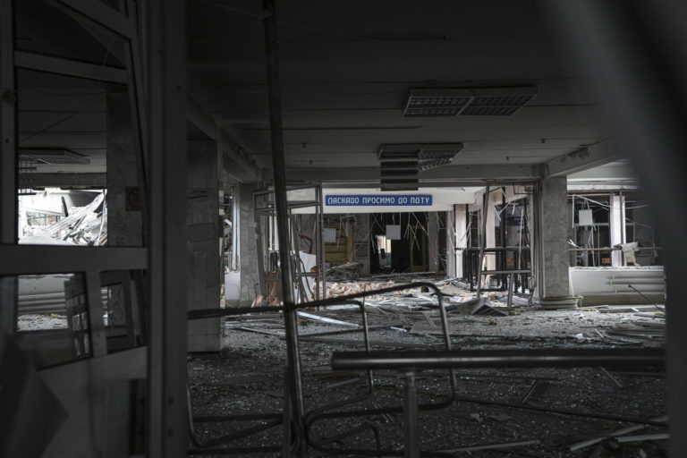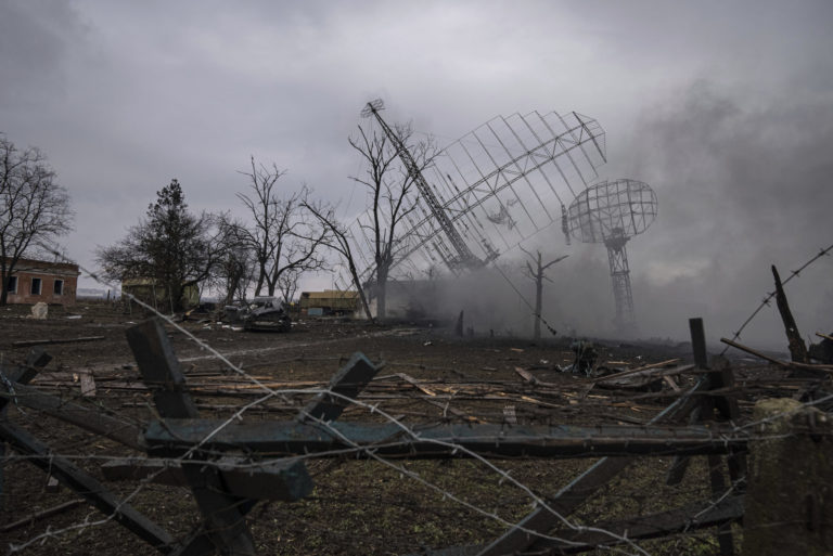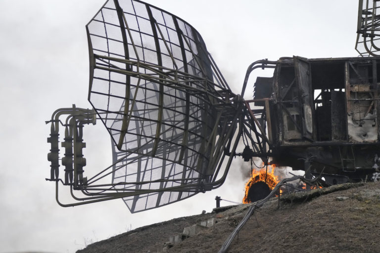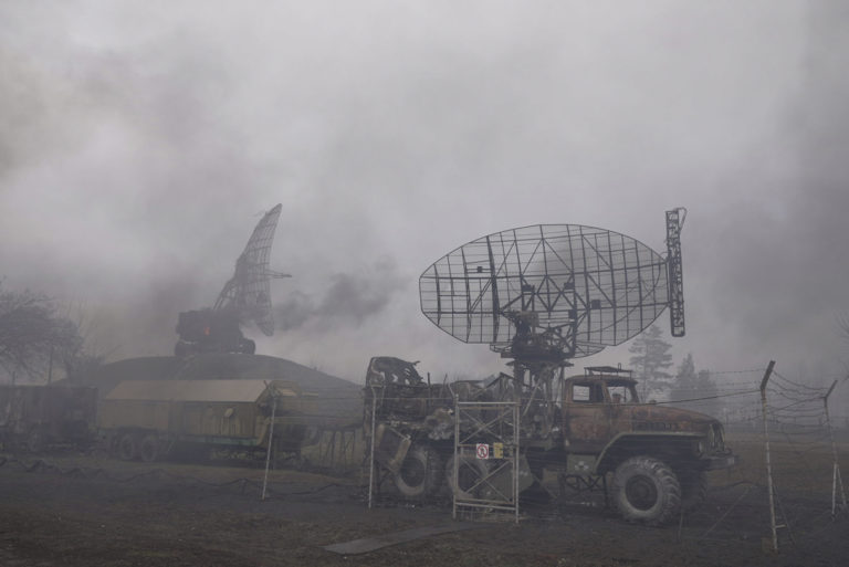 Poškodený radar na základni protivzdušnej obrany v Mariupole na Ukrajine. Foto: SITA/AP