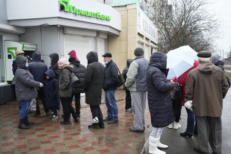 Ľudia stoja v rade pred bankomatom ATM v Mariupole, aby si vybrali peniaze. Foto: SITA/AP