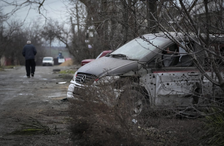 Poškodené auto a trosky po ruskom ostreľovaní v Mariupole na Ukrajine. Foto: SITA/AP