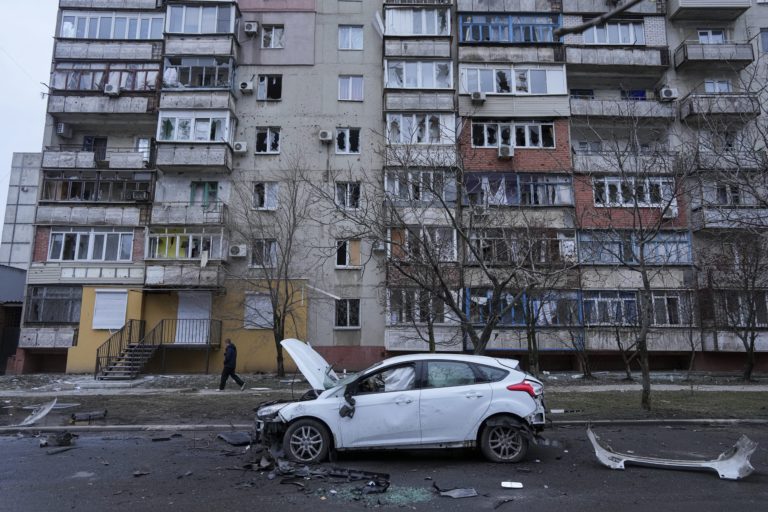 Budova v obytnej štvrti v Mariupole na Ukrajine je poškodená po ostreľovaní. Foto: SITA/AP
