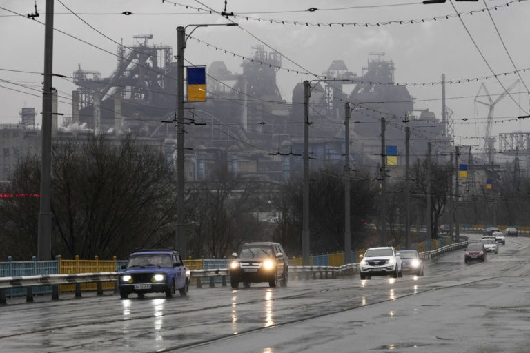 Autá prechádzajúce okolo hutníckeho závodu Mariupol v Mariupole na Ukrajine. Foto: SITA/AP