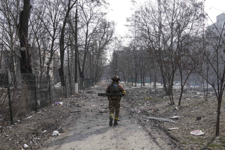 Ukrajinský vojak kráča neďaleko pozície, ktorú strážil v Mariupole na Ukrajine. Foto: SITA/AP