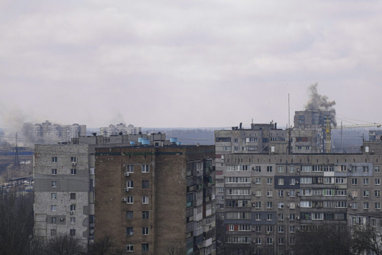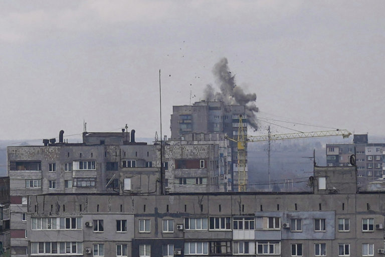 Z budov v meste Mariupoľ stúpa dym. Foto: SITA/AP
