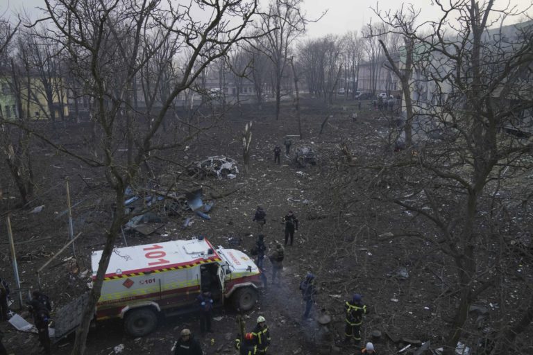 Ukrajinskí vojaci a záchranári pracujú pri poškodenej pôrodnici v Mariupole na Ukrajine, na ktorú v stredu 9. marca 2022 zaútočili Rusi. Foto: SITA/AP