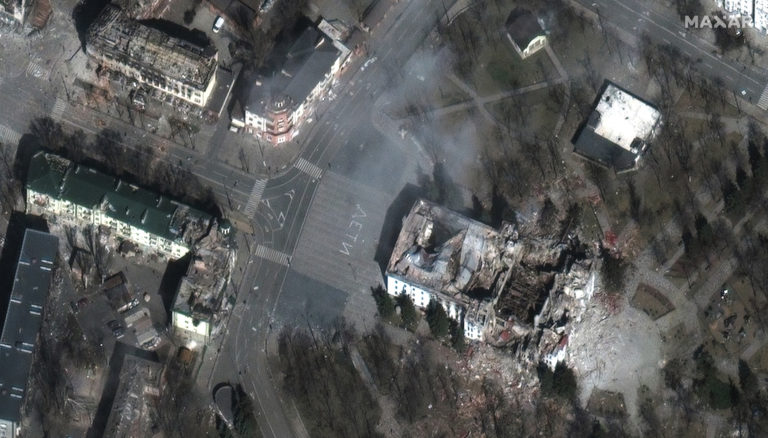 Satelitná snímka zbombardovaného divadla v Mariupole. Foto: Maxar Technologies/AP