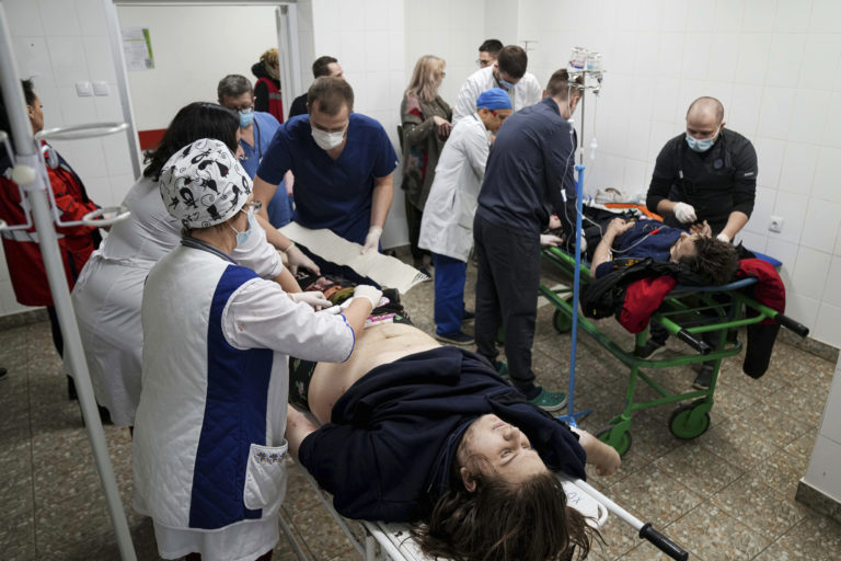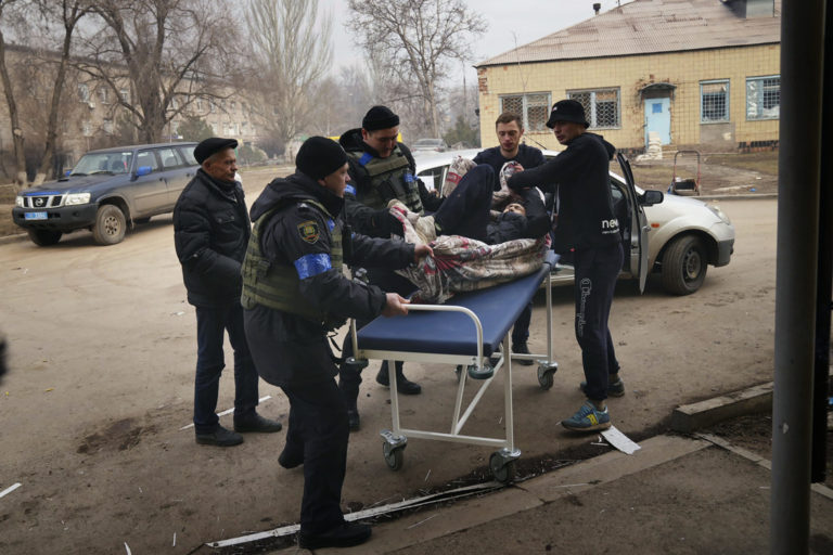 Ukrajinskí vojaci a dobrovoľníci prevážajú muža zraneného počas ostreľovania do nemocnice číslo 3 v Mariupole na Ukrajine v utorok 15. marca 2022. Foto: SITA/AP