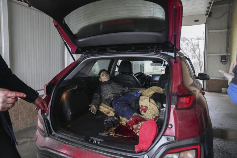Zranený tínedžer Artyom (15) po ostreľovaním leží v aute a čaká na presun do pôrodnice prerobenej na lekárske oddelenie v Mariupole. Foto: SITA/AP