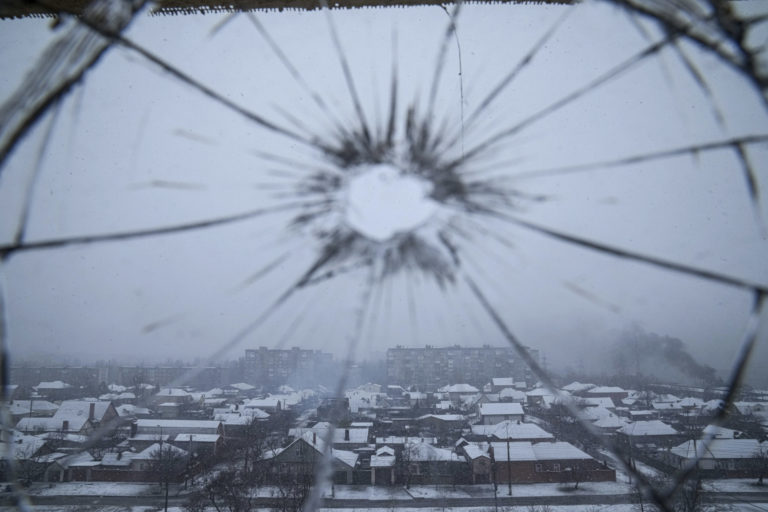 Okno nemocnice je rozbité po ostreľovaní v Mariupole. Foto: SITA/AP