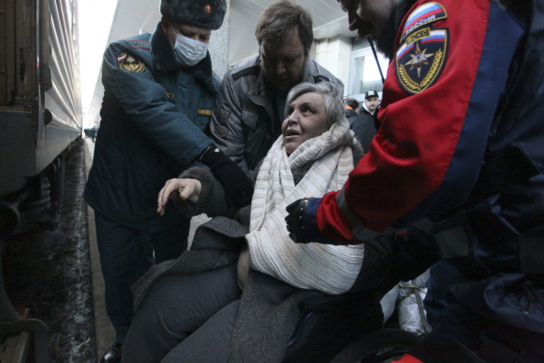 Dobrovoľníci pomáhajú staršej žene, ako ľuďom z Mariupolu a okolia na východe Ukrajiny odísť z vlaku. Foto: SITA/AP