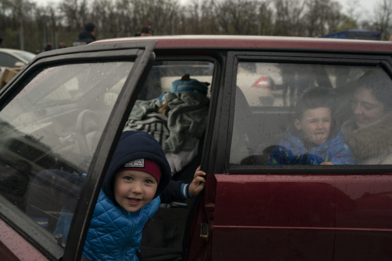Rostislav (4) sa usmieva do kamery, keď prichádza so svojou rodinou a priateľom Yaroslavom z Mariupolu do utečeneckého centra v Záporoží na Ukrajine vo štvrtok 21. apríla 2022. Foto: SITA/AP