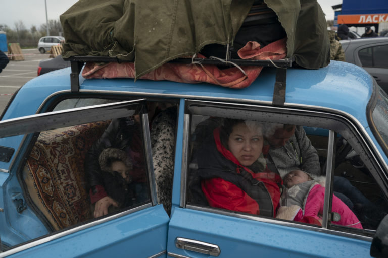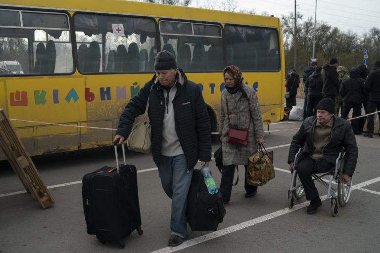 Ľudia utekajúci z Mariupolu prichádzajú do utečeneckého centra v Záporoží na Ukrajine vo štvrtok 21. apríla 2022. Foto: SITA/AP