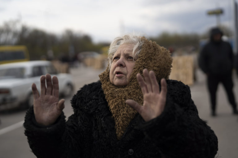 Valentina Greenchuck (73) gestikuluje po príchode z okupovaného Mariupolu do utečeneckého centra v Záporoží na Ukrajine vo štvrtok 21. apríla 2022. Foto: SITA/AP