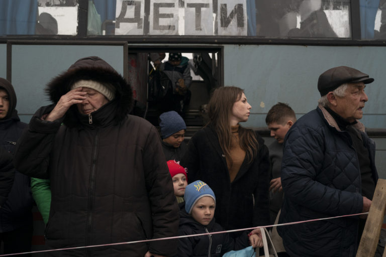 Rusi nasilu odvážajú Mariupoľčanov z mesta. Foto: SITA/AP