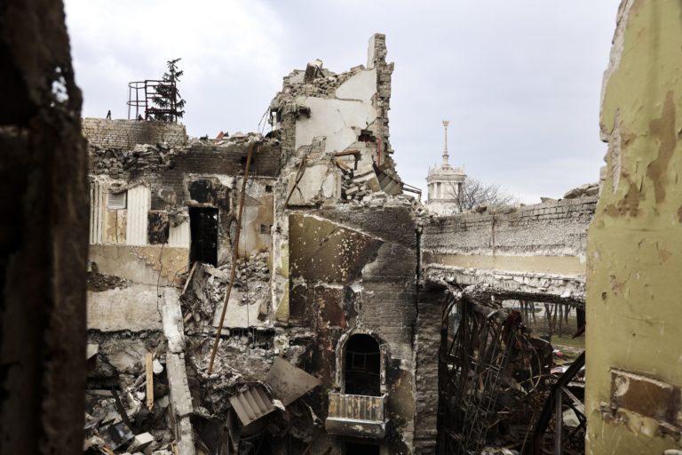 Pohľad na poškodené divadlo v okupovanom ukrajinskom meste Mariupol. Foto: SITA/AP