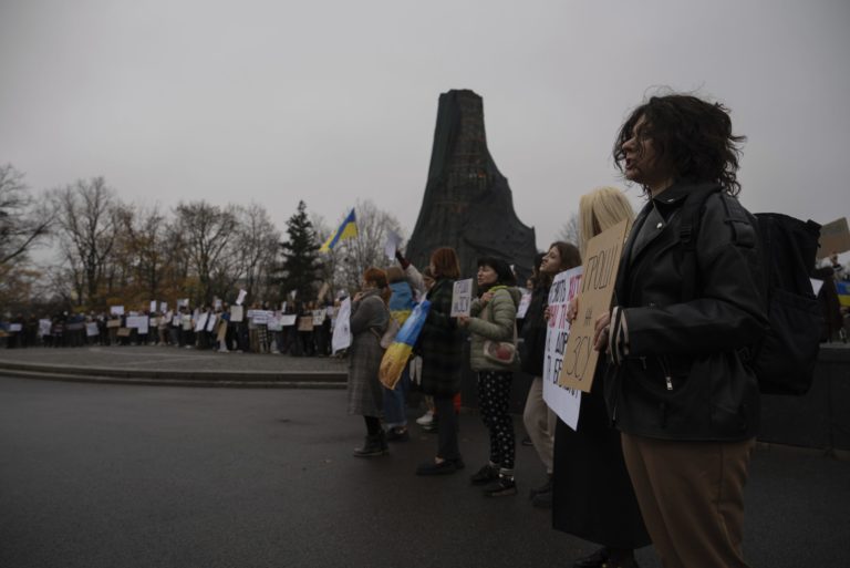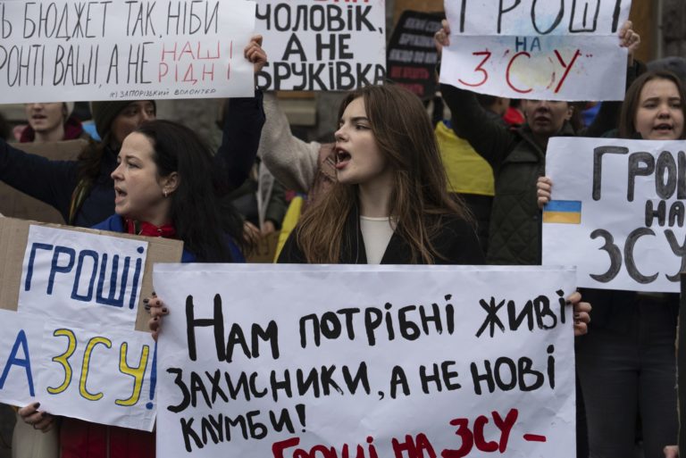 Žena vpravo drží plagát s nápisom: „Peniaze ozbrojeným silám“ počas účasti na zhromaždení v centre Charkova na Ukrajine v sobotu 4. novembra 2023. Ľudia sa zhromaždili, aby protestovali proti korupcii a žiadali prerozdelenie rozpočtových prostriedkov pre armády. Foto: SITA/AP