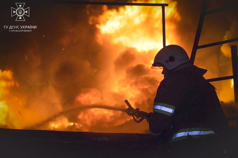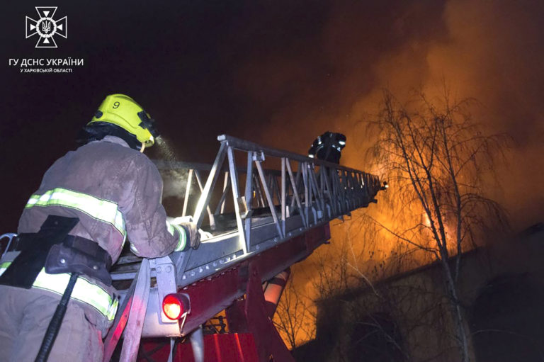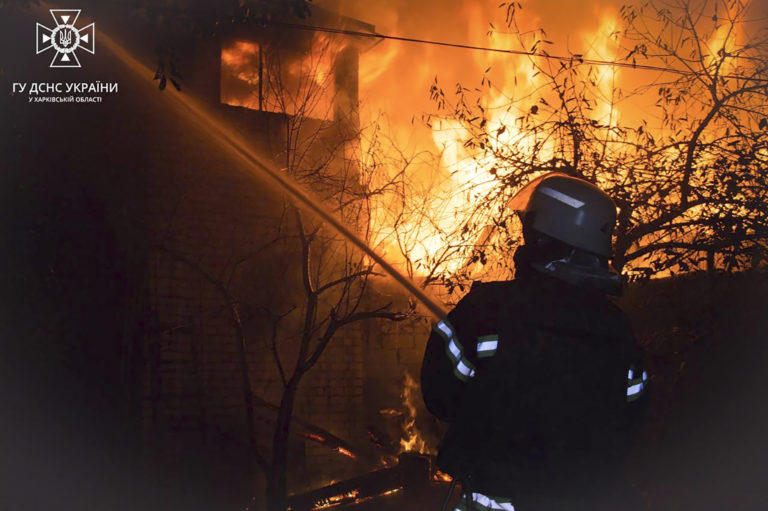 Na tejto fotografii, ktorú poskytla ukrajinská pohotovostná služba, pracovníci záchrannej služby pracujú na uhasení požiaru v Charkove na Ukrajine v piatok 3. novembra 2023 po útoku ruských bezpilotných lietadiel. Neboli hlásené žiadne obete. Foto: Ukrainian Emergency Service via AP