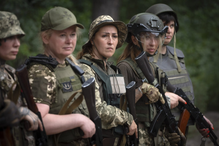 Dobrovoľníčky ženskej mobilnej protivzdušnej obrany Bucha Witches počas cvičenia neďaleko Kyjeva. Foto: SITA/AP.